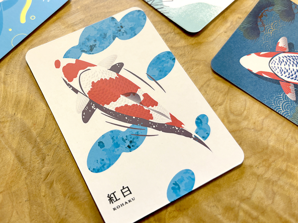 カードゲーム『てのひら錦鯉』全22種カードイラスト&パッケージ裏面イラストクライアント : 株式会社博展イラスト/北窓優太錦鯉の里(新潟県)から、もっとたくさんの人に錦鯉の魅力を伝えたいというテーマで作られたカードゲーム。箱を開けると、裏側には日本庭園が広がり、そこで優雅に泳ぐ姿を想起させます。自然が生み出した美しく多様な模様にそって、それぞれにデザインタッチをかえて表現した全22種類の錦鯉たちです。